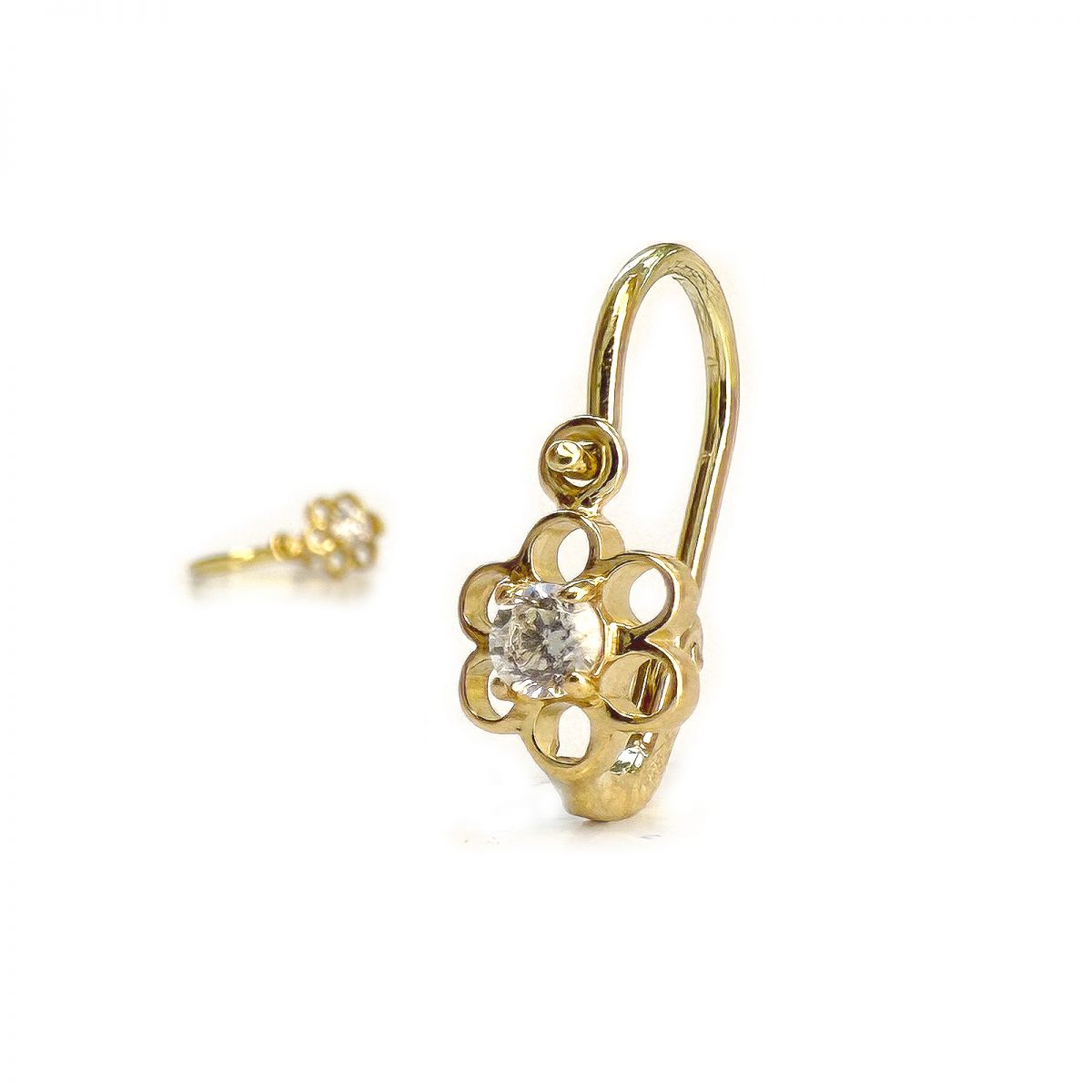 Ez a baba fülbevaló 14 karátos aranyból készült, és egy kedves, áttört virágmintát formáz, amelynek közepén egy csillogó fehér kő kapott helyet. A forma egyszerre játékos és kifinomult, így kiváló választás első ékszerként. A biztonságos előlkapcsos zár stabil viseletet nyújt a legkisebbeknek is, miközben az ékszer elegáns, mégis gyermeki bájt sugároz. Keresztelőre, babalátogatóra vagy születésnapra ideális ajándék – egy olyan darab, amely éveken át megőrzi meghitt jelentőségét.