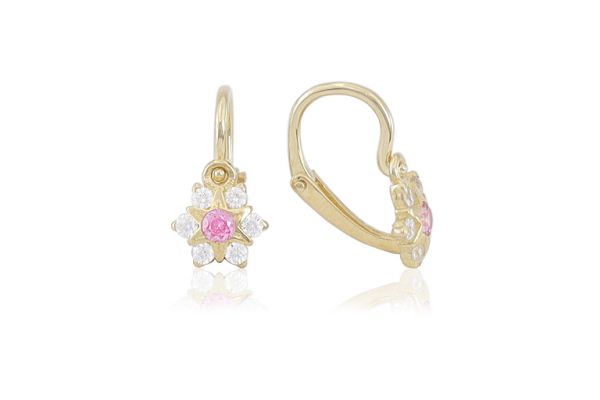 Arany baba fülbevaló elölkapcsos csillagvirág rózsaszín és fehér kövekkel