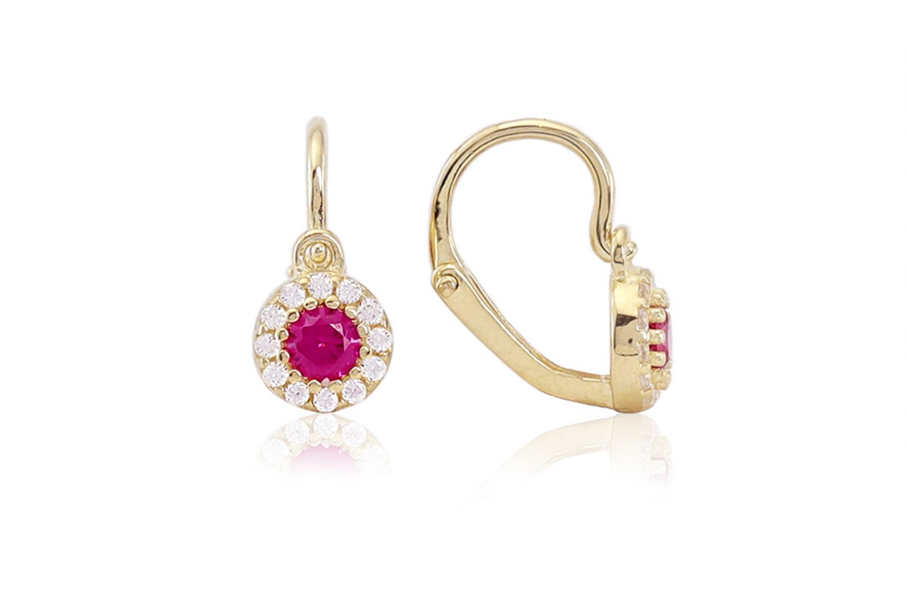 Arany baba fülbevaló elölkapcsos klasszikus stílusú pink és fehér kővel