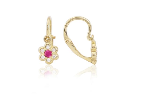 Arany baba fülbevaló elölkapcsos pici virág pink és fehér kővel