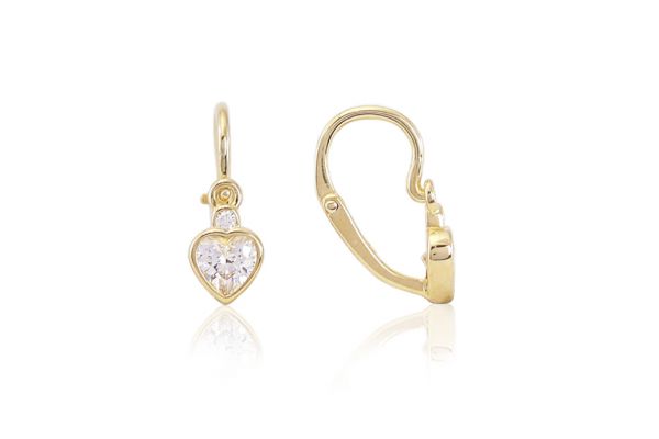 Arany baba fülbevaló elölkapcsos szív és button fehér kövekkel