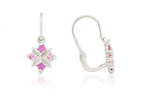 Fehér arany gyermek fülbevaló elölkapcsos négy foglalt kővel rózsaszín és pink