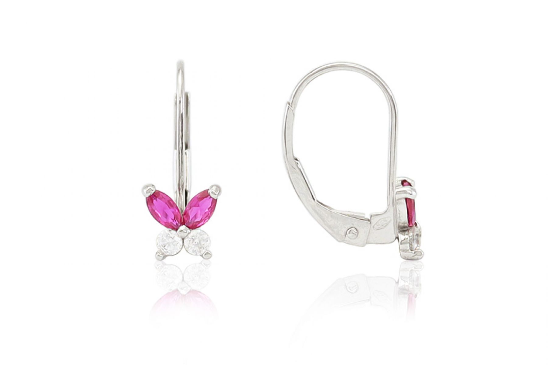 Amennyire aprócska, annyira szép és elegáns ez a szikrázó pink és fehér cirkónia kővel díszített fehér arany pillangó mintás fülbevaló.