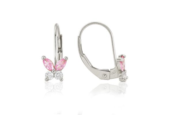 Amennyire aprócska, annyira szép és elegáns ez a szikrázó rózsaszín és fehér cirkónia kővel díszített fehér arany pillangó mintás fülbevaló.