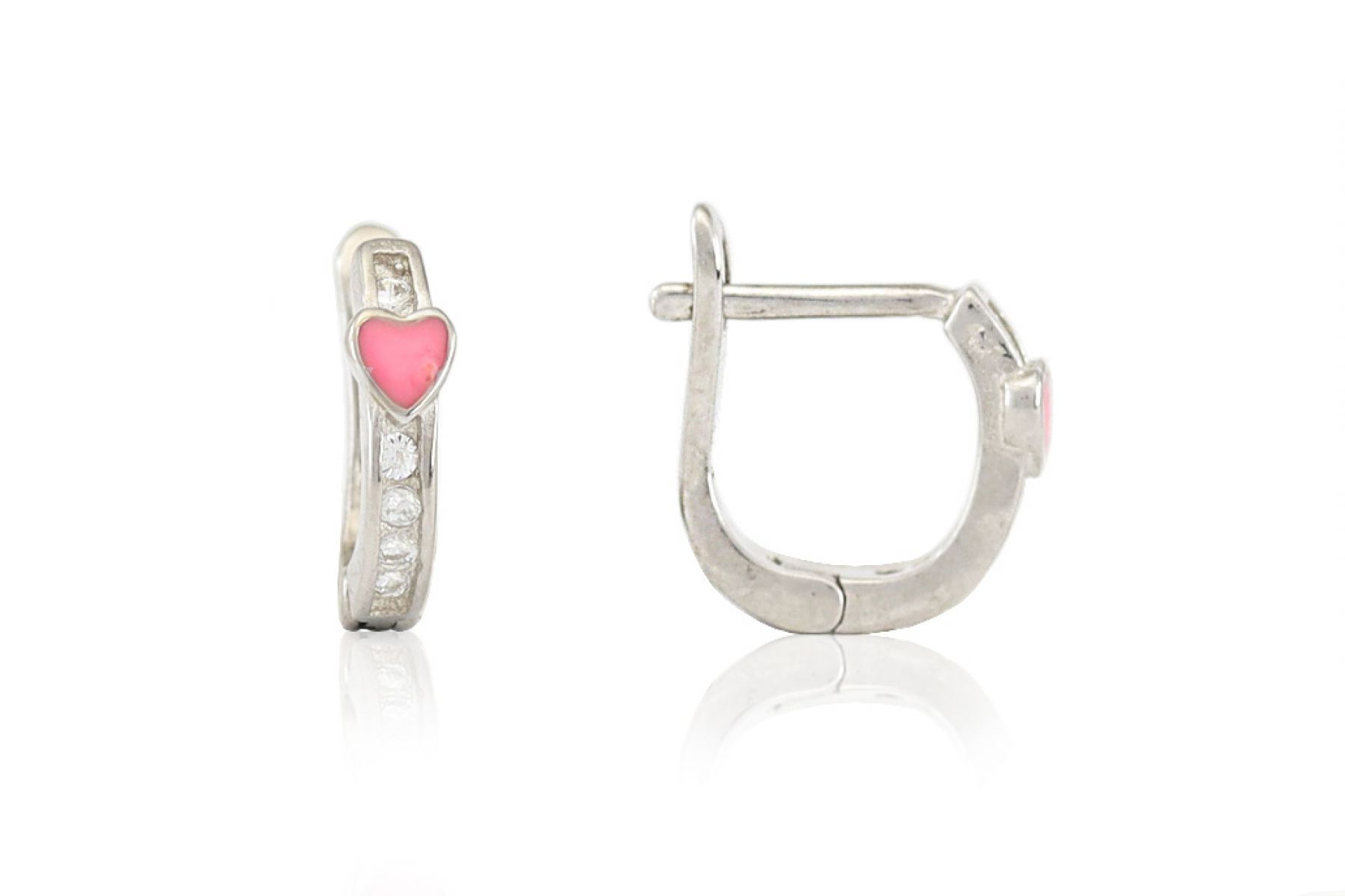 Hihetetlenül aranyos ez a nagyon apró fehér cirkónia kövecskékkel és 1-1 rózsaszín szivecskével díszített ezüst fülbevaló!