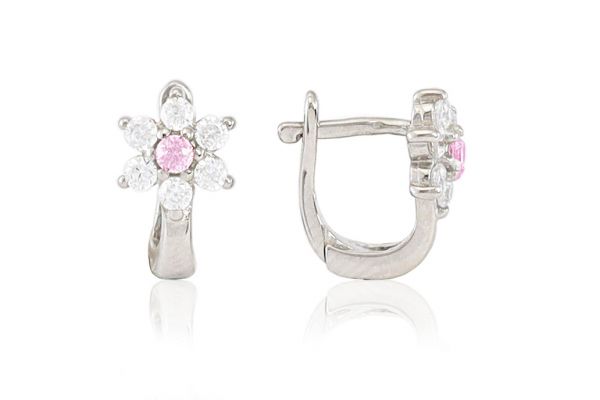 Rózsaszín köves, franciakapcsos virágmintás ezüst baba fülbevaló