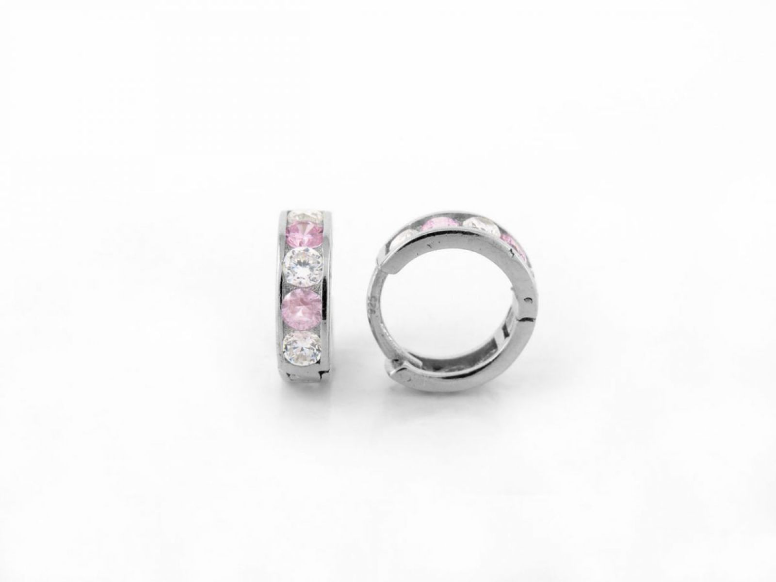 Rózsaszín és fehér köves bepattintós karika ezüst baba fülbevaló ródiumbevonatos