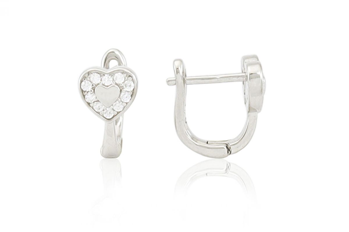 Hihetetlenül aranyos ez a nagyon apró fehér cirkónia kövecskékkel és 1-1 apró szivecskével díszített ezüst fülbevaló!