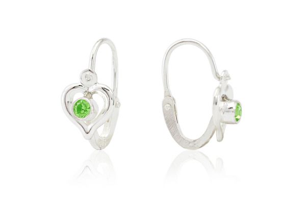 Ez az egyik legaranyosabb ezüst gyermek fülbevalónk! Az apró zöld kövecskék vidáman szikráznak a szívecskék közepén, bájos hatást kölcsönözve viselőjének.