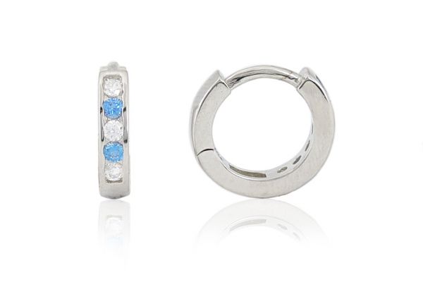 Ezüst gyermek fülbevaló keskeny karika világoskék és fehér kövekkel