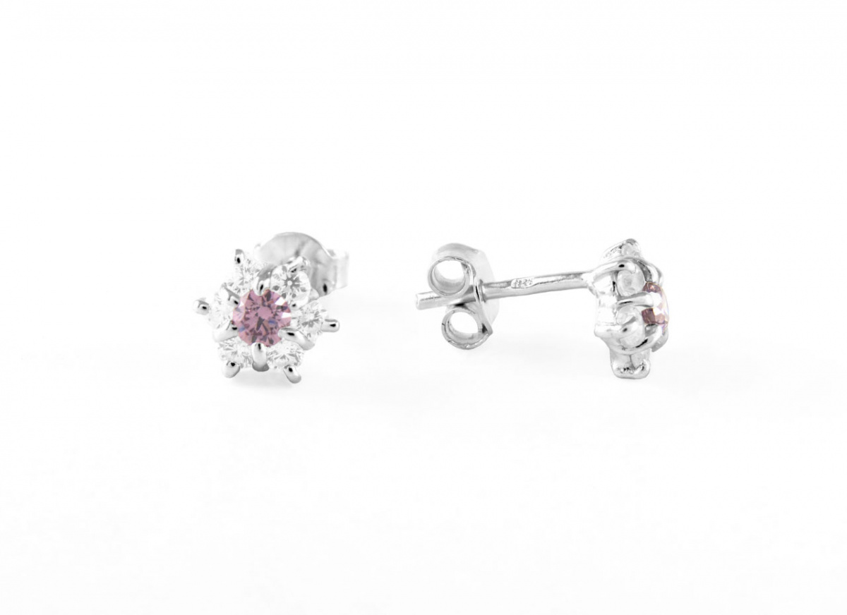 Nagyon aranyos és elegáns ez az apró virágos ezüst gyermek fülbevaló, melyet orgonaszínű és fehér cirkónia kövecskék díszítenek.