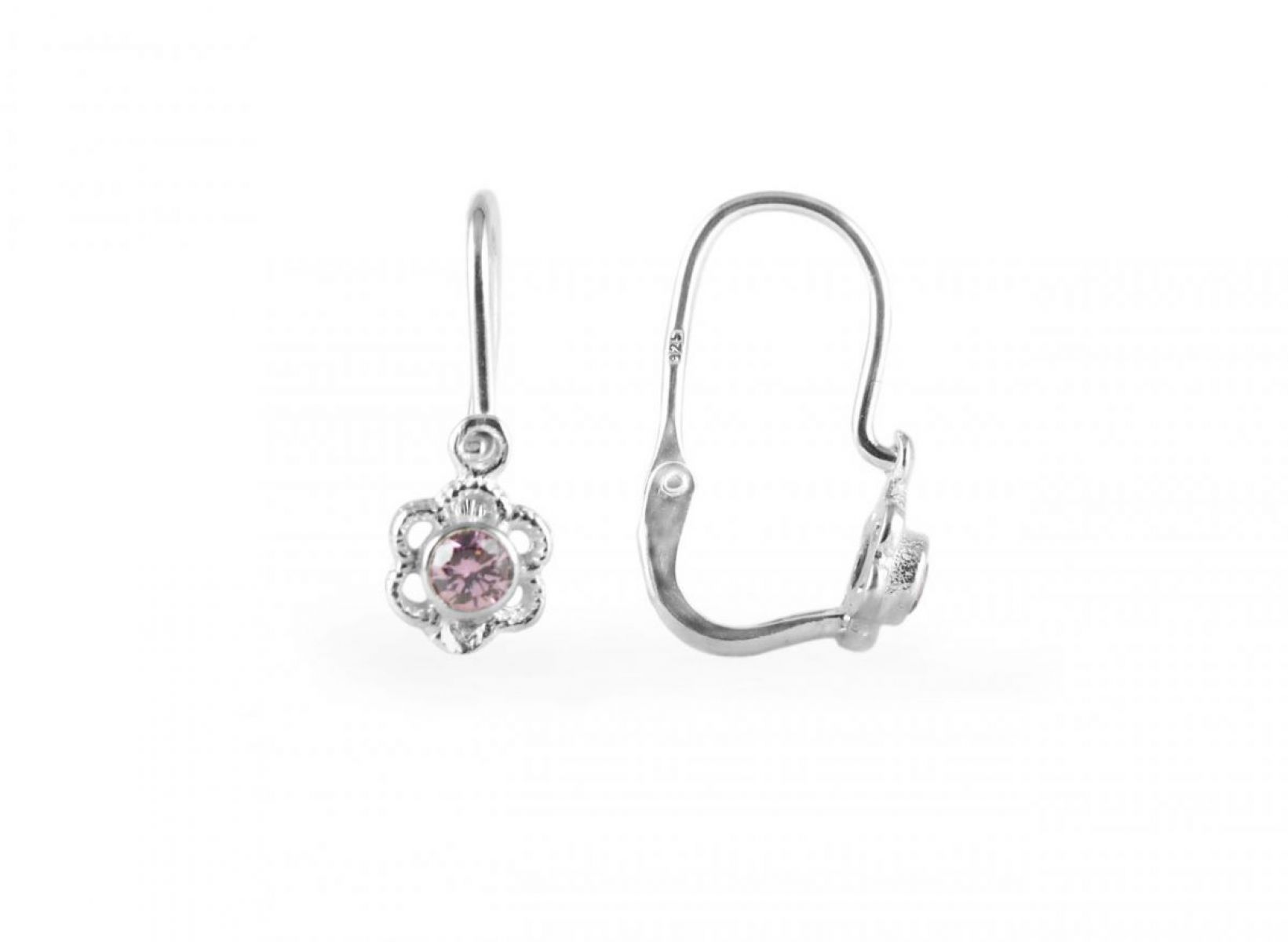 Ezüst gyermek fülbevaló előlkapcsos virág rózsaszín kővel ródium bevonattal